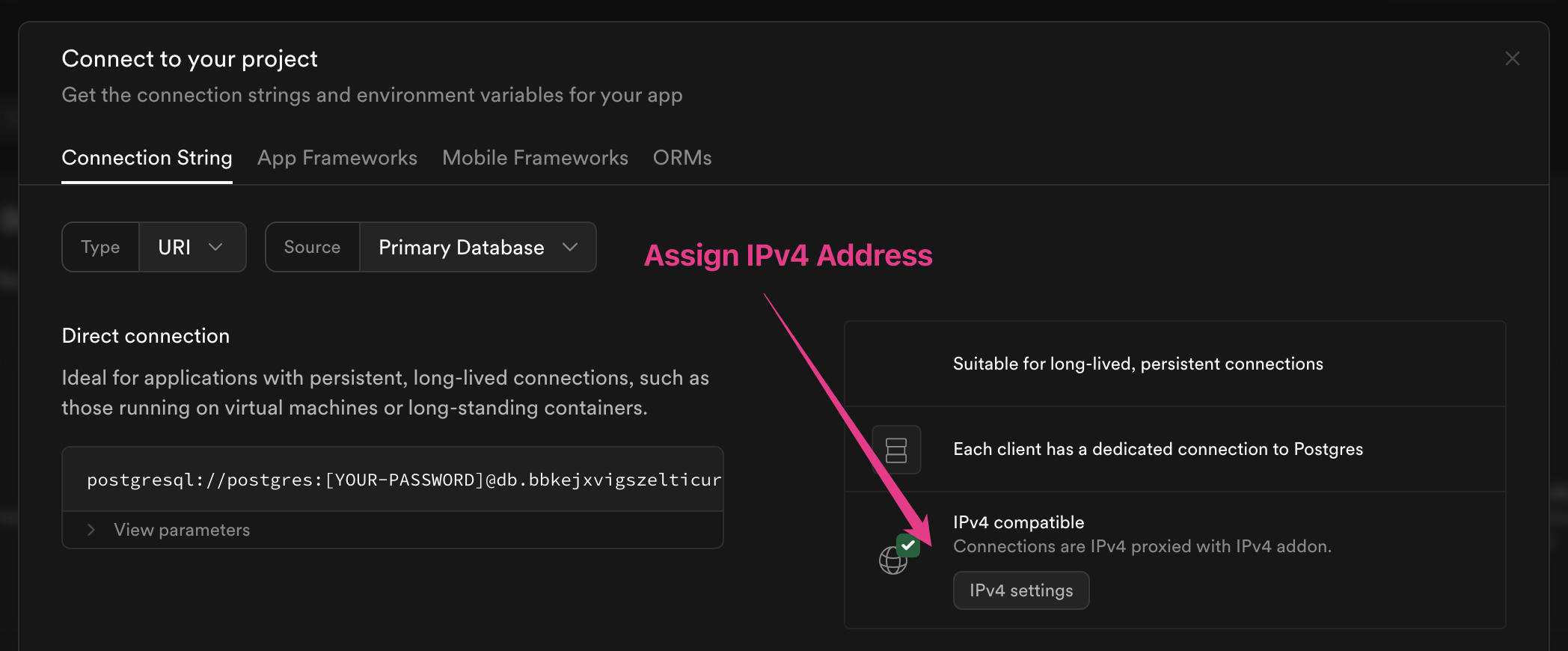You may also need to assign an IPv4 address to your Supabase instance: